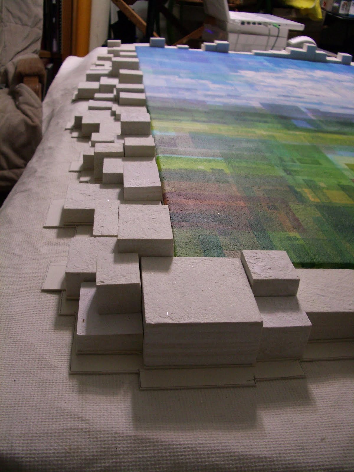 Listening to books on tape while assembling and glueing, cutting profiles and then finally coming to halt when the Golden gel medium ran out. To be continued with the next shipment from Dick Blick.